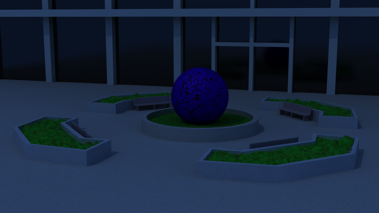 Most of the light in this scene comes from the dark blue sky radiosity. I also added a low-intensity pale yellow light in the sky to use moonlight, to create additional depth to the scene.